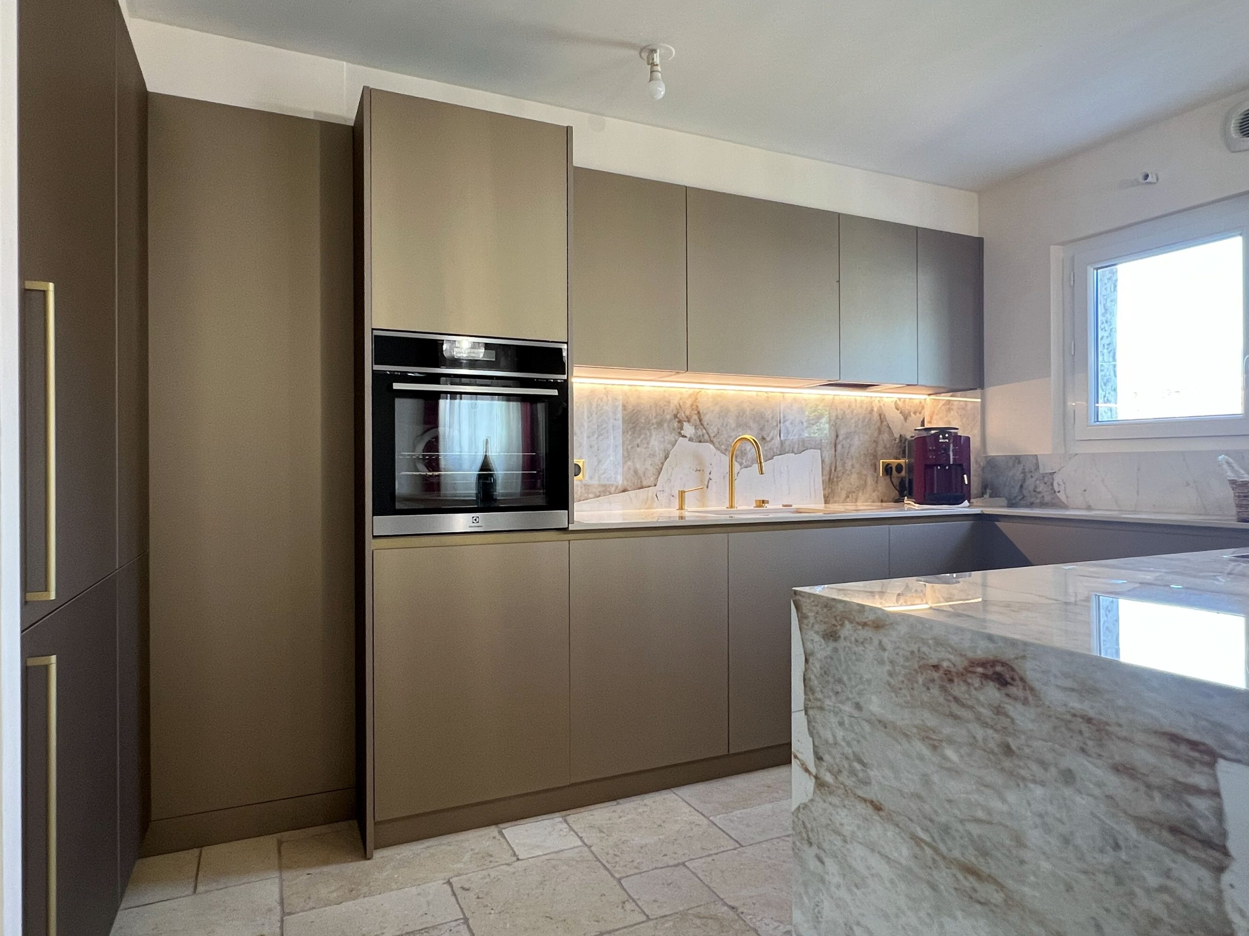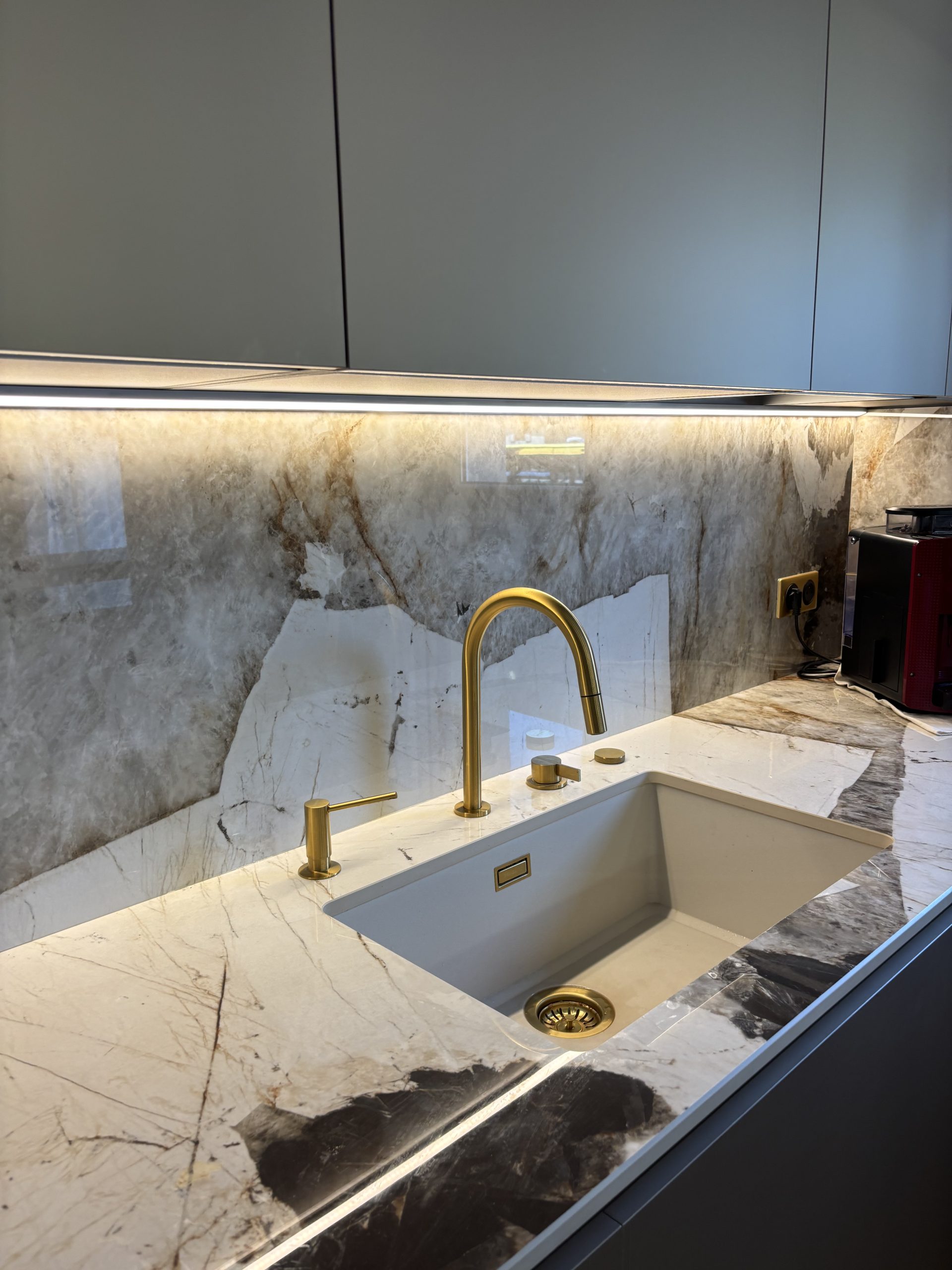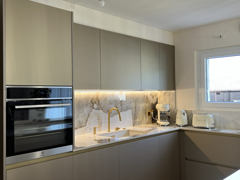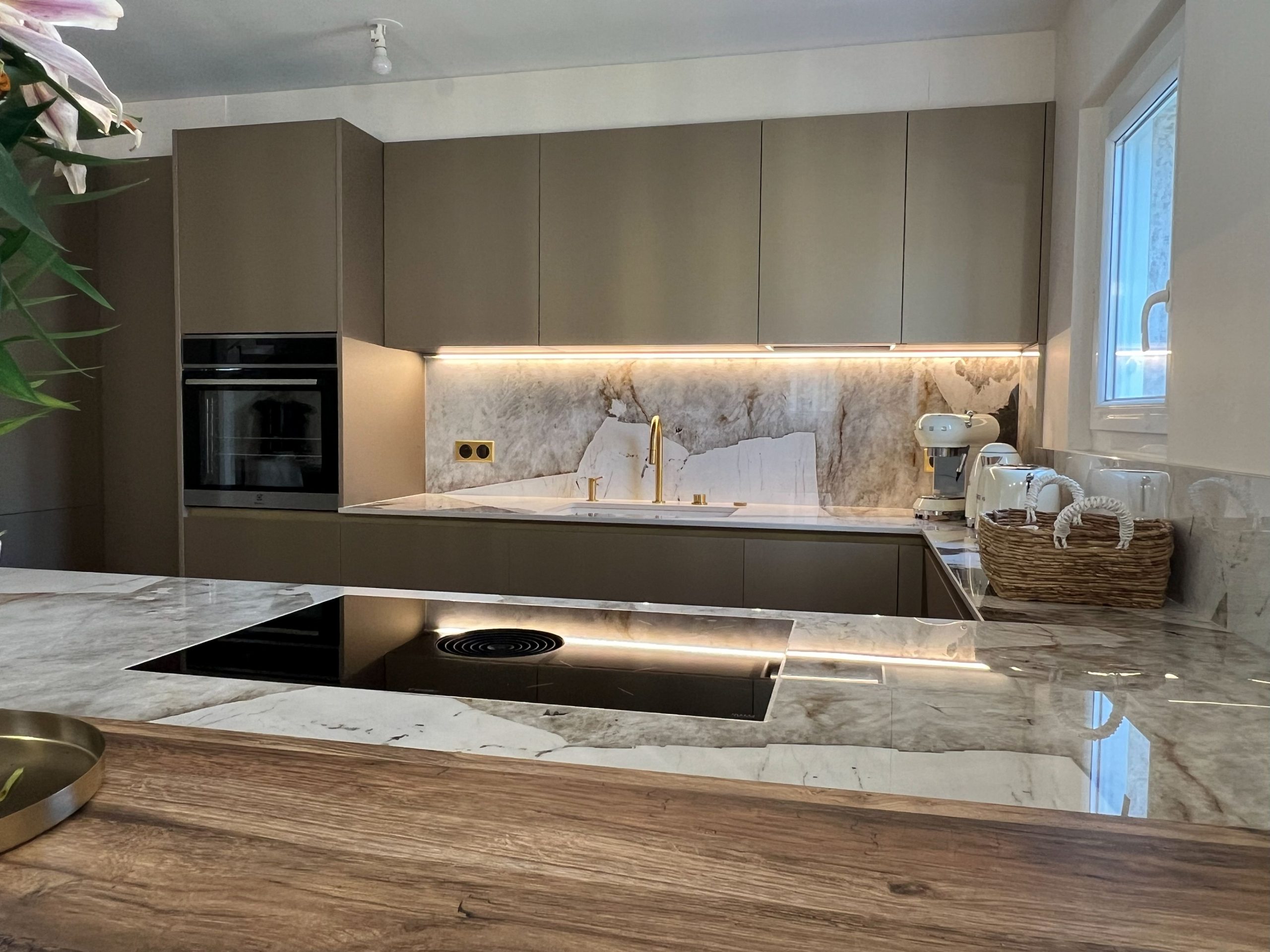 Cuisine Antares, façades PET Natrix Gold, Plans de travail Céramique Khalo
