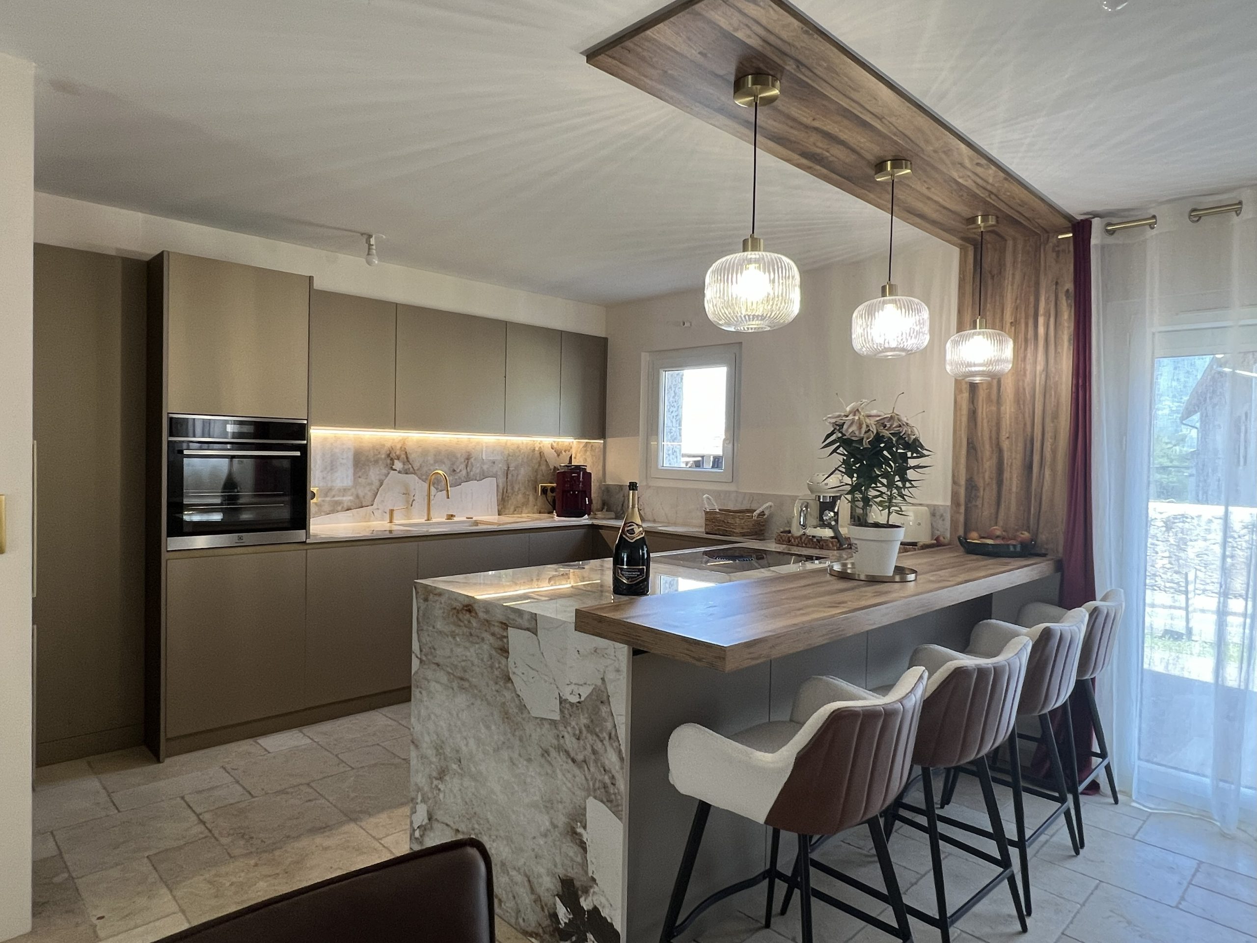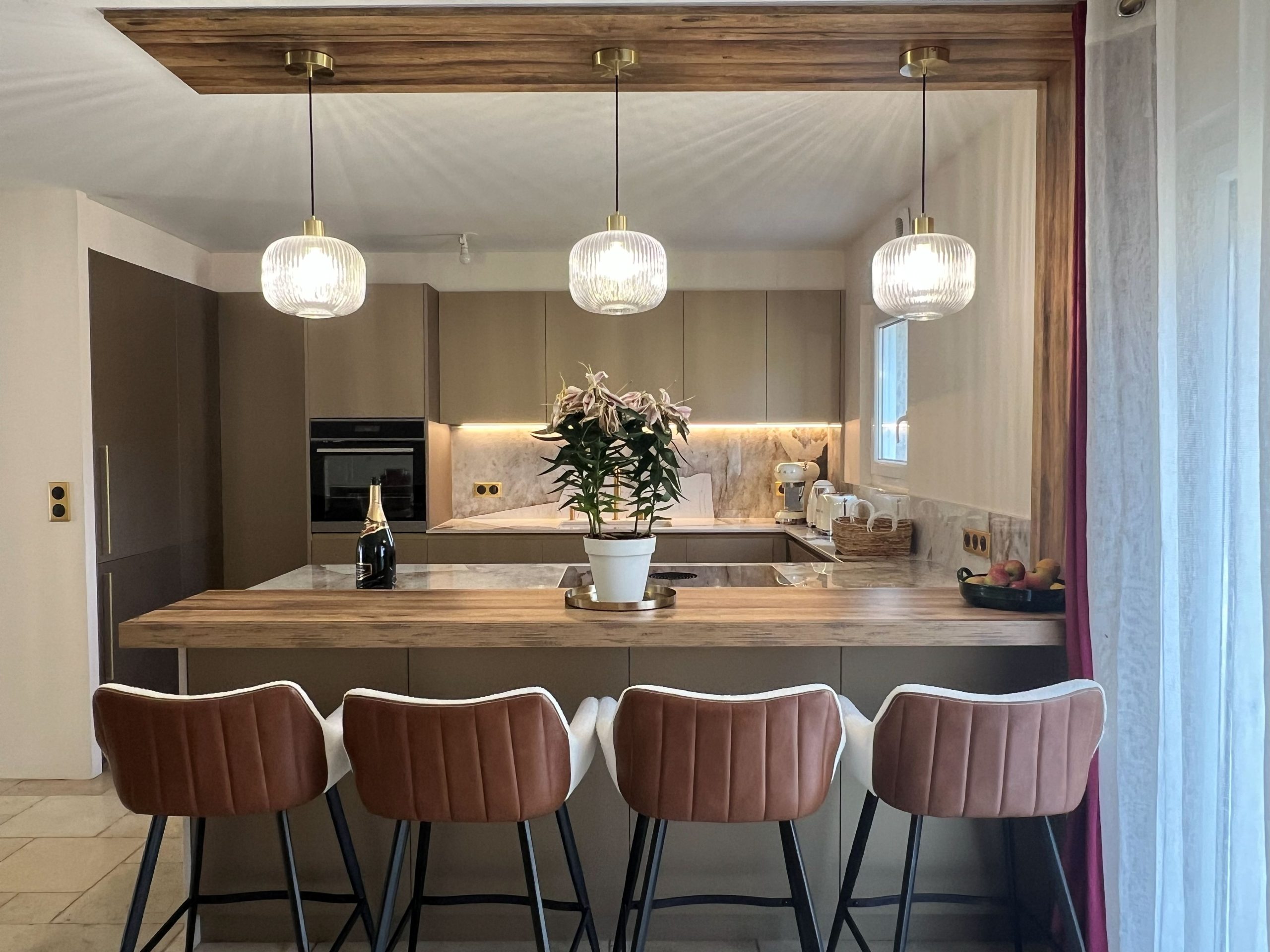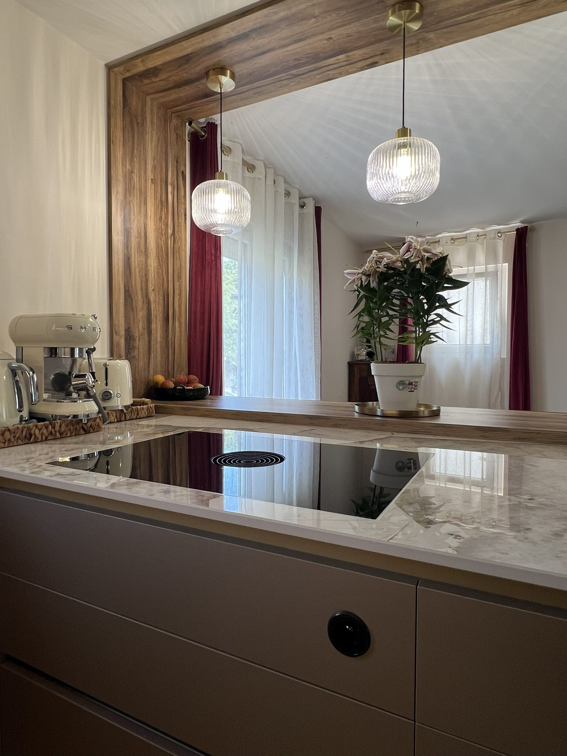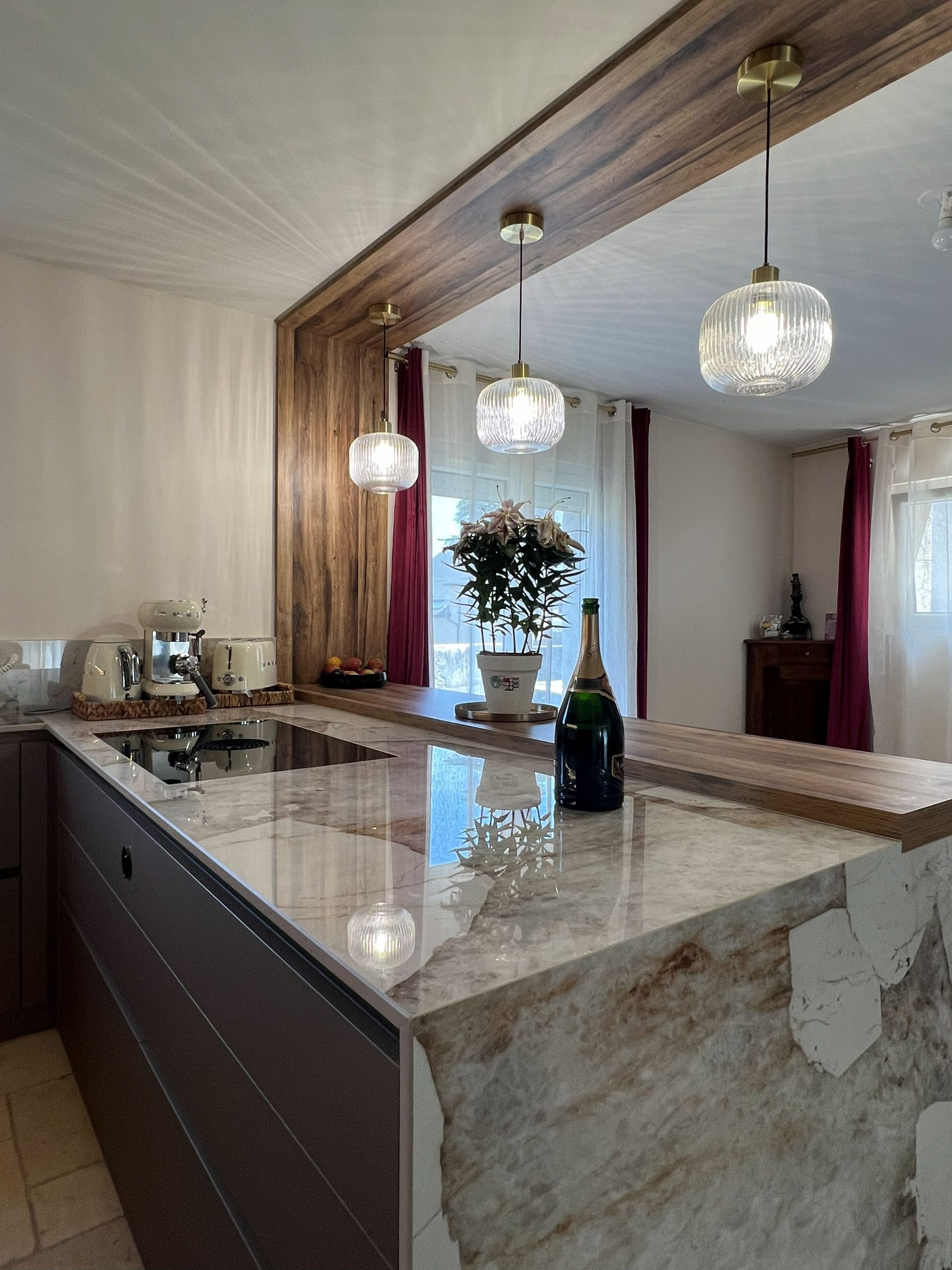 Cuisine Antares, façades PET Natrix Gold, Plans de travail Céramique Khalo